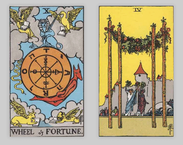 タロットでは「運命の輪」と「ワンドの4」が出ました。