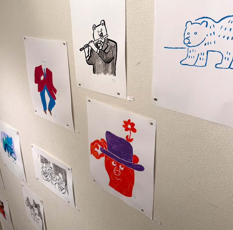ユーモアと自由な感性に満ちた作品が壁一面に並び、眺めているだけで思わず笑顔になるような空間です。
