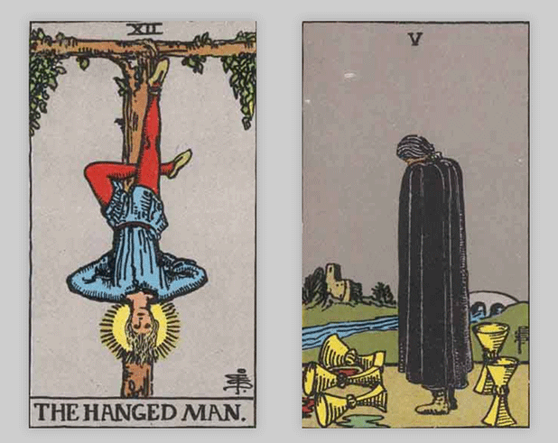 タロットカードでは「吊るされた男」と「カップの5」が出ました。