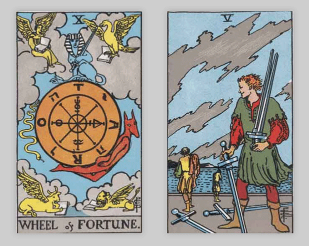 タロットカードでは「運命の輪」と「ソードの5」が出ました。