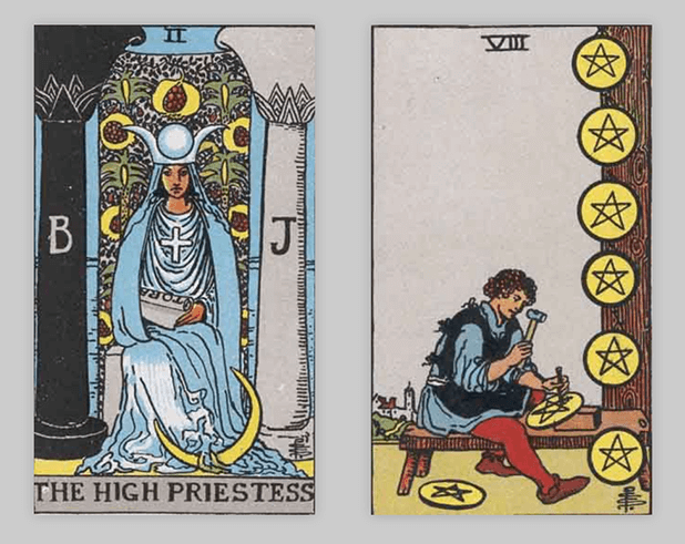 タロットカードでは「女教皇」と「ペンタクルの8」が出ました。