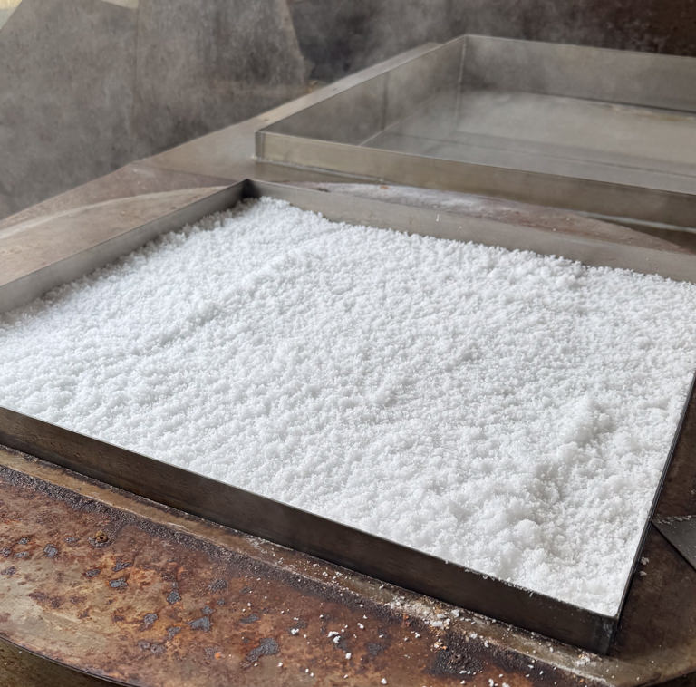 写真は乾燥中の塩と濡れて結晶がキラキラしている塩です。(雪じゃないです 笑)初めての光景に驚きました。