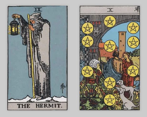 タロットカードでは「隠者」と「ペンタクルの10」が出ました。