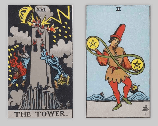 タロットカードでは「塔」と「ペンタクルの2」が出ました。