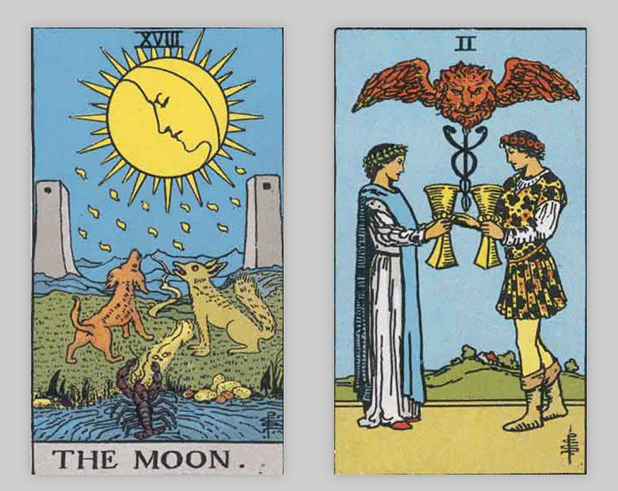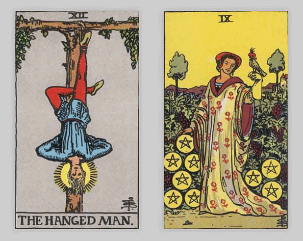 タロットカードでは「吊るされた男」と「ペンタクルの9」が出ました。