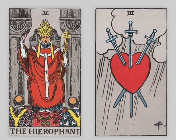 タロットカードでは「法皇」と「ソードの3」が出ました。