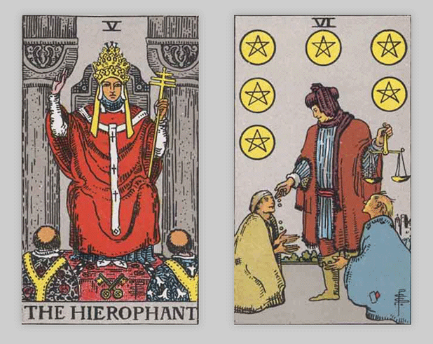 タロットカードでは「法皇」と「ペンタクルの6」が出ました。
