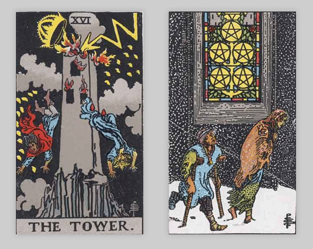 タロットカードでは「塔」と「ペンタクルの5」が出ました。