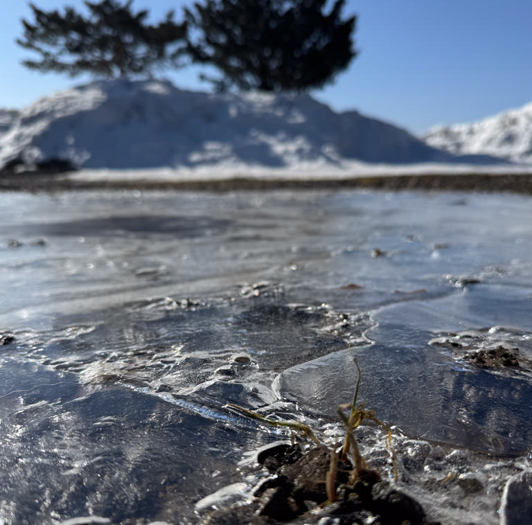 写真は、雪解けが進み、水たまりの氷がとても綺麗だったので撮ってみました。