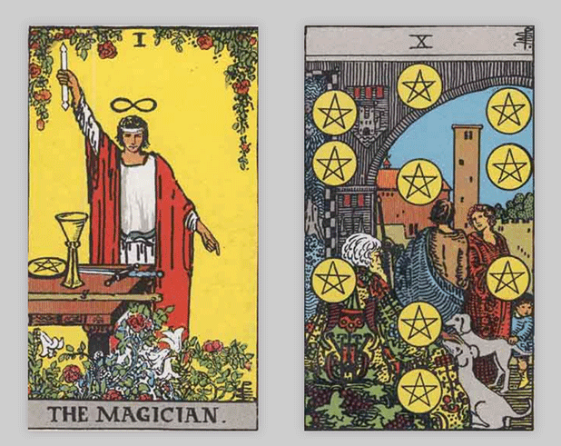 タロットカードでは「魔術師」と「ペンタクルの10」が出ました。